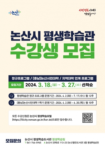 상반기 프로그램은 4월부터 7월까지 운영되며 논산시에 주소를 둔 시민이라면 누구나 논산시 평생학습포털 홈페이지에서 온라인 접수하면 된다.