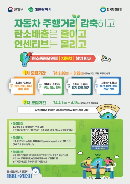 [금요저널] 대전시는 자동차 주행거리 감축실적에 따라 인센티브를 지급하는 ‘2024년 탄소중립포인트 자동차 분야’참여자 5,207명을 선착순으로 모집한다.