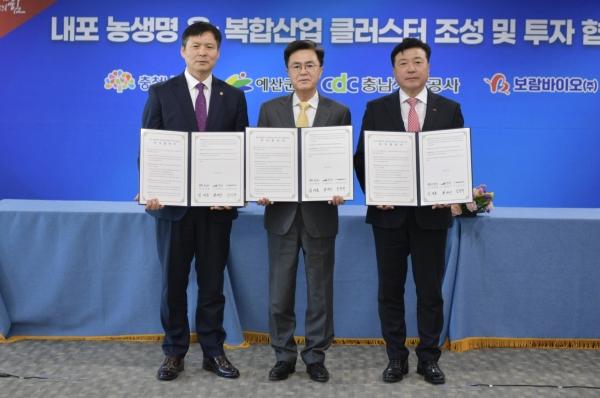 [금요저널] 예산군은 14일 도청 상황실에서 ‘내포 농생명 융·복합 클러스터 조성’을 위한 업무 및 투자협약을 체결했다.