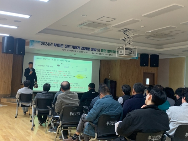 [금요저널] 부여군보건소는 지난 14일 읍·면 방역담당자 및 주민 자율방역단 등 총 70여명이 참석한 가운데 진드기 매개 감염병 및 방역소독 운영에 대한 이해를 주제로 교육을 실시했다.