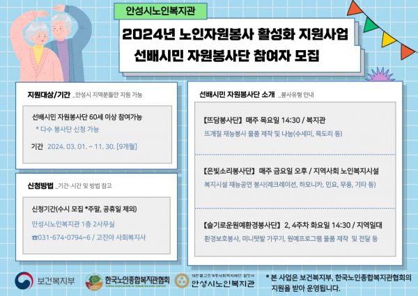 안성시노인복지관, 2024년 노인자원봉사 활성화 지원사업 선배시민 자원봉사단 참여자 모집