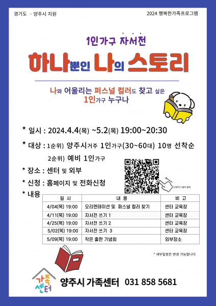 2024년 행복한 가족프로그램의 일환으로 진행하는 이번 프로그램은 최근 증가하고 있는 1인 가구의 삶의 질 향상을 위한 사회적 관계망 형성을 위해 오는 4월 4일부터 5월 2일까지 총 5회기로 진행되며 주요내용으로는 ▲ 1인가구 나만의 퍼스널 컬러 ▲자서전 쓰기 ▲ 자서전 출판 ▲ 작은 출판 기념회로 구성됐다.