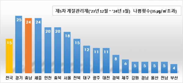 전국 평균 15회와 비교하면 10회나 더 많이 발생한 것으로 미세먼지로 인한 도민건강의 주의가 요구되고 있다.