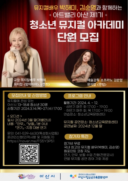 [금요저널] 아산시는 오는 27일까지 뮤지컬 배우 박해미와 소프라노 김순영이 함께하는 ‘아트밸리 아산 제1기 청소년 뮤지컬 아카데미’에 참여할 아산시 13~18세 청소년 단원을 모집한다.