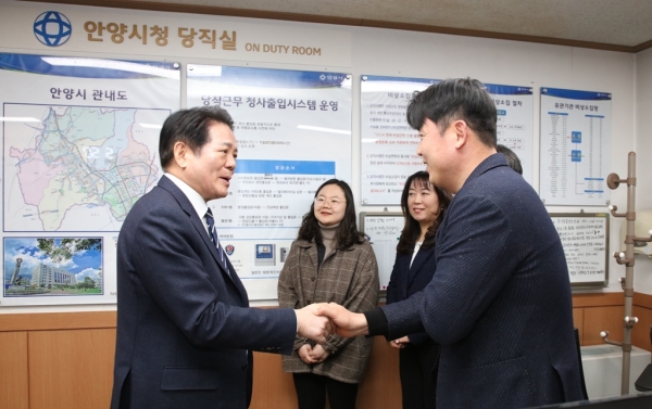 최대호 안양시장은 양성 통합당직 실시에 따른 첫 근무자를 격려하기 위해 18일 오후 당직실에 방문했다.
