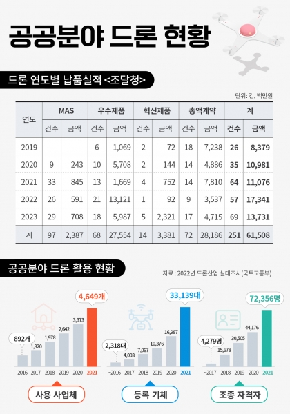 조달청은 이번 제도개선을 통해 기술품질 경쟁력을 확보해 공공에서의 드론 활용도를 높이고 국내 제조 드론 제품에 안정적 판로를 제공해 글로벌 시장으로 진출하는 선순환 구조를 만들 수 있을 것으로 기대하고 있다.