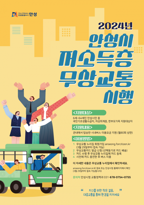 안성시 저소득층 무상교통 신청은 오는 3월 29일부터 가능하며 안성시 무상교통 누리집에서 회원가입 후 카드를 신청하면 우편으로 발송된다.