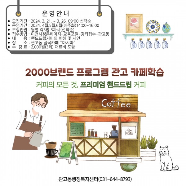 [금요저널] 이천시 관고동행정복지센터는 2000브랜드 프로그램 관고 카페학습으로 “프리미엄 핸드드립 커피”프로그램 운영 계획을 밝혔다.