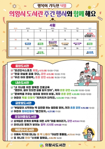 올해 도서관 주간 행사는 중앙도서관, 내손도서관, 글로벌도서관, 포일어울림도서관, 백운호수도서관이 참여하며 ‘행복이 가득한 4월 의왕시 도서관 주간 행사와 함께해요’라는 슬로건 아래 다독자 시상, 체험, 공연, 강연 등 가족과 함께 할 수 있는 즐길 거리가 풍성하게 마련돼 있다.
