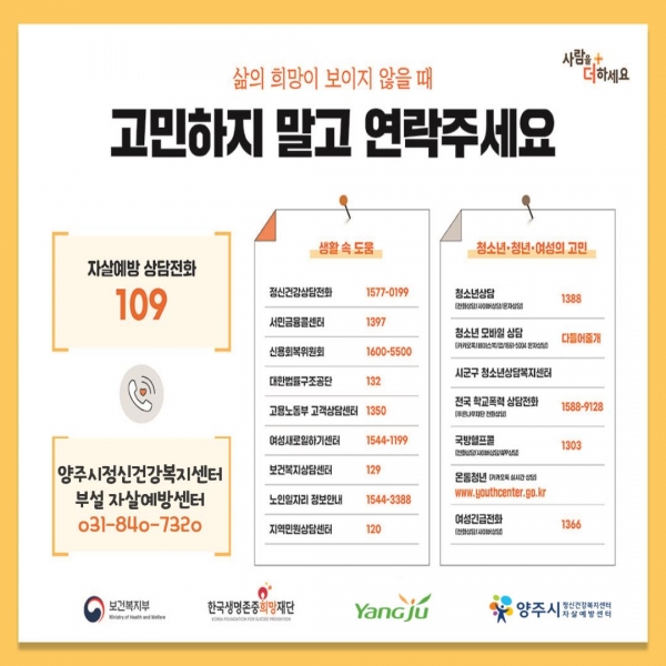 이에 양주시 자살예방센터는 봄철 자살 예방을 위해 자살 예방 집중 홍보, 자살 고위험군 조기 발굴 및 집중관리, 관계기관 협력 네트워크 강화 등 다양한 조치를 취하고 있다.