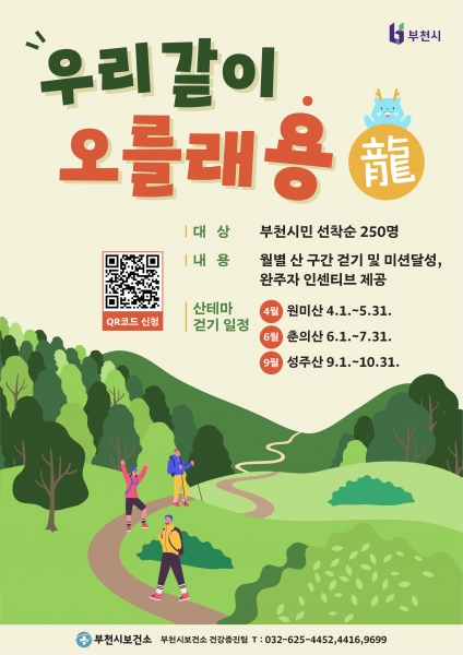 ‘우리같이 오를래용龍’은 4월 원미산을 시작해 6월 춘의산, 9월 성주산 총 3개의 산을 테마로 한 건강걷기 챌린지 프로그램이다.