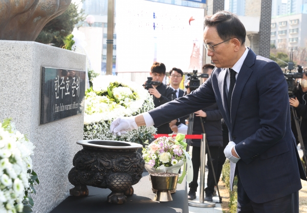 식전 행사인 추모식에서는 한주호 준위 동상 앞에서 헌화와 분향을 올리며 참배했다.