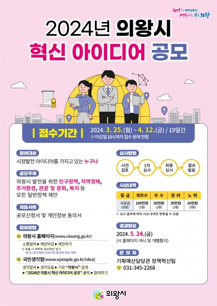 [금요저널] 의왕시는 시민들의 다양하고 참신한 아이디어를 시정에 반영하기 위해 이달 25일부터 4월 12일까지 19일간 `2024년 의왕시 혁신 아이디어 공모’를 실시한다고 밝혔다.