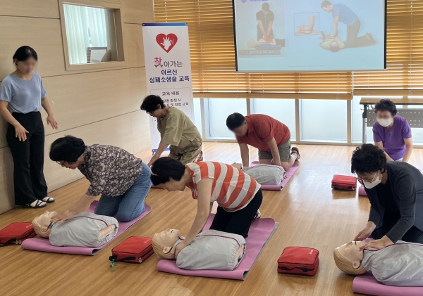 교육은 각 동별로 상·하반기 1회씩 실시하며 심정지 인지와 119 신고법, 가슴압박술과 자동심장충격기 사용법을 배우고 마네킹을 활용해 실습한다.