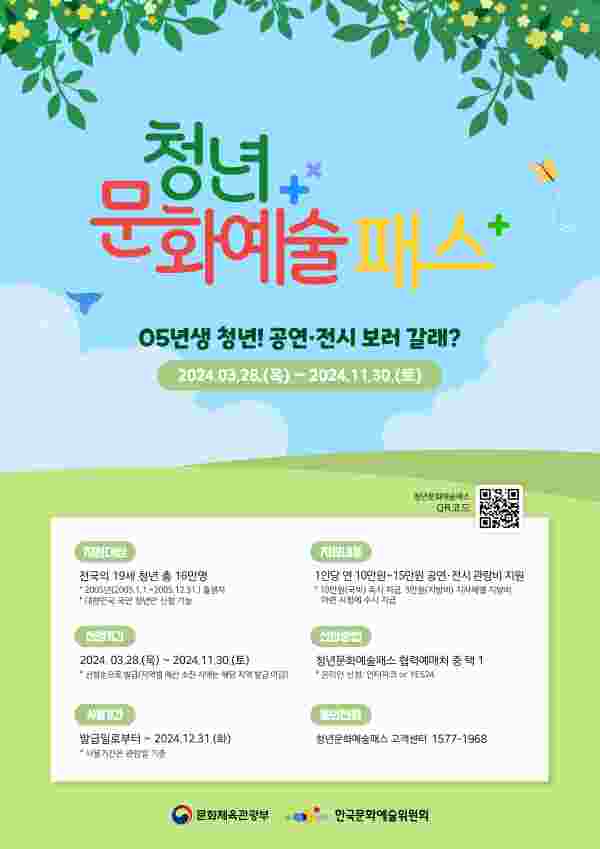 청년 문화예술패스는 문화예술인 창작활동 간접 지원과 문화예술시장 확대 등을 위해 19세 청년들에게 문화예술 관람료를 지원하는 것으로 지원금은 온라인 협력예매처에서 공연 및 전시 티켓을 예매할 때 사용할 수 있다.
