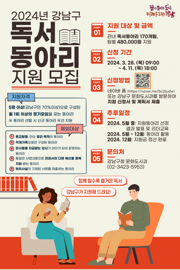 조성명 강남구청장은 “독서 동아리를 지원해 생활 속 독서 모임 활동을 활성화하고 동아리 간 커뮤니티를 강화하고자 한다”며 “구민들이 책으로 소통할 수 있는 다양한 지원 사업을 추진해 책 읽는 도시 강남을 만들어 나가겠다”고 밝혔다.