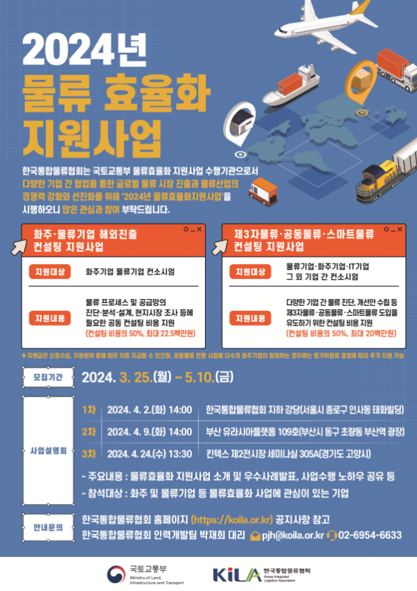 [금요저널] 국토교통부는 ’24년 물류 효율화 지원사업 공모 활성화를 위해 4월 2일 서울을 시작으로 3회에 걸쳐 사업 설명회를 개최한다.