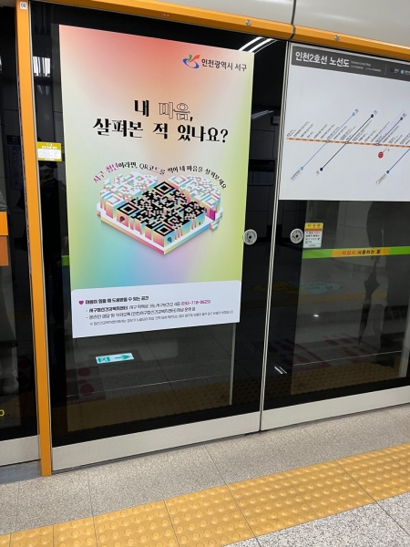 최근 학업·취업 경쟁 등으로 인해 스트레스· 불안· 우울감을 겪는 청년들이 늘어남에 따라 서구는 청년들을 위해 ‘내 마음 살펴본 적 있나요?’라는 메시지와 자가검진으로 연결되는 QR코드를 담은 홍보물을 지하철역 스크린 도어에 설치했다.