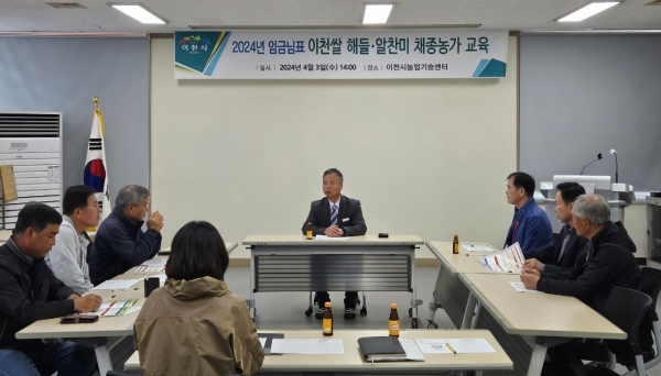 이날 교육은 농업기술센터 식량작물팀장의 교육으로 채종포 육묘관리, 본답관리, 포장검사 및 수매검사, 수확 등 채종포 및 원종포 운영 방안에 대한 내용으로 진행됐으며 참여 농가는 최고품질의 임금님표 이천쌀을 생산한다는 자부심을 가지고 열정적으로 교육에 임했다.