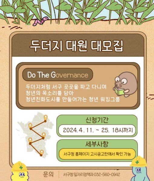 청년 주도 청년친화도시 TF 두더지는 ‘Do The Governance’의 약자로 두더지처럼 서구 곳곳을 파고 다니며 청년의 목소리를 담아, 청년친화도시 조성을 위한 실천과제를 만들고 수행하는 청년 워킹 그룹이다.