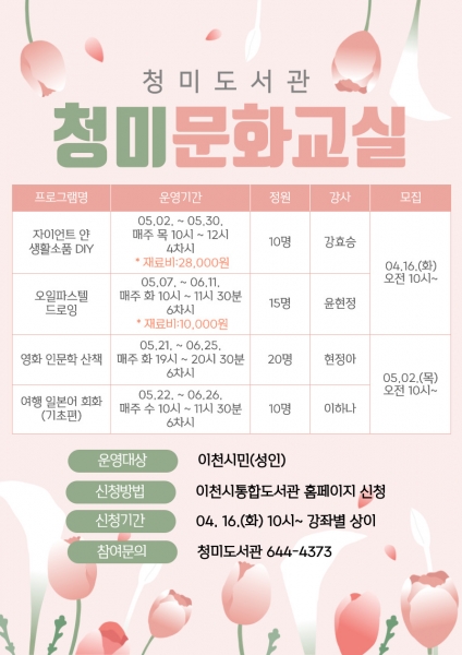 [금요저널] 이천시 청미도서관에서 오는 5월 2일부터 이천시민의 정서함양과 여가선용을 위해 상반기 청미문화교실을 운영한다고 밝혔다.