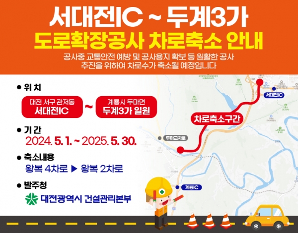 서대전IC~두계3가 도로 확장 공사 추진중 도로 이용자들의 안전 확보 및 원활한 공사 추진을 위해 2025년 5월까지 차로를 축소하게 됐다.