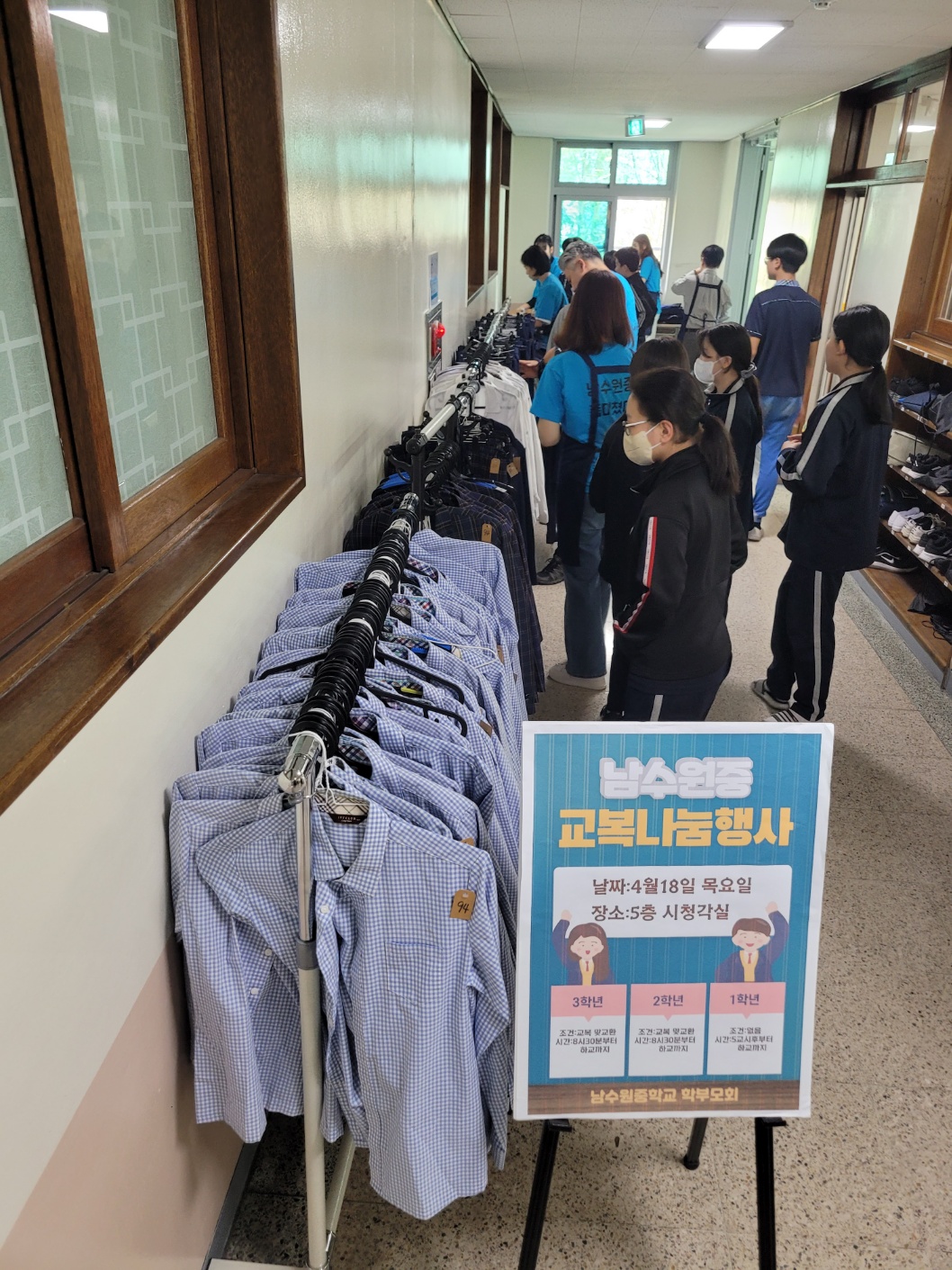 수원 남수원중학교(교장 김형태)에서는 4월 18일 학부모들과 학생들이 함께 참여하는 특별한 행사가 열렸다. 이 행사는 “교복 나눔” 행사로, 학생들이 졸업하거나 성장하여 더 이상 입지 않는 교복을 필요한 학생들에게 나눠주는 뜻깊은 자리이다.