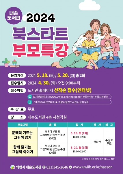 [금요저널] 의왕시 내손도서관은 ‘2024년 북스타트 부모 특강’을 5월 18일 5월 20일 총 2회 운영한다.