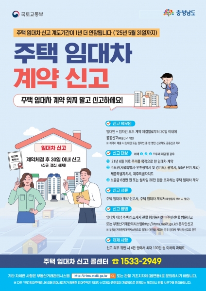 [금요저널] 충남도는 올해 5월 31일까지 시행 예정이었던 ‘주택 임대차 계약 신고제’ 계도기간을 내년 5월 31일까지 1년 추가 연장한다고 25일 밝혔다.