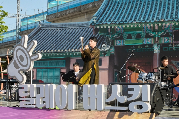 이봉근 명창은 25일 온양온천역 광장에서 펼쳐진 릴레이 버스킹 ‘이순신을 외치다’ 무대에 올라 ‘성웅 이순신 충무공가’를 열창했다.