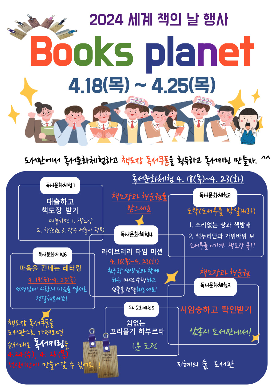 수원 남수원중학교(교장 김형태)에서는 세계 책의 날을 맞이하여 4월 17일(수)부터 25일(목)까지 독서의 즐거움을 만끽할 수 있는 'Books Planet' 독서 행사가 열렸다. 이 행사에서는 학부모, 교직원, 그리고 학생들이 함께 참여하여 독서를 통한 지식의 향연과 교류의 장이 마련되었다.‘마음을 건너는 레터링',‘라이브러리 타임 미션',‘쉼 없는 꼬리물기 하브루타' 등의 다양한 체험활동을 통해 참가자들은 책과 더욱 친숙해질 수 있는 기회를 얻는 시간이 되었다.