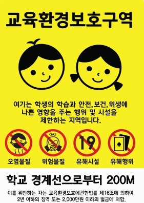 교육환경보호구역은 ‘교육환경 보호에 관한 법률’에 따라 학교 경계선으로부터 직선거리 200m 내 지역을 보호구역으로 설정하며 보호구역 내에는 학교의 보건·위생과 안전, 학습에 나쁜 영향을 끼치는 금지행위와 시설의 설치를 제한하고 있다.