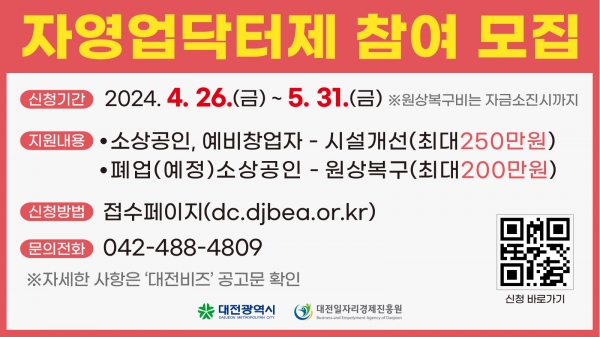김선자 대전시 소상공정책과장은 “경제적 어려움을 겪고 계신 소상공인분들에게 이번 자영업닥터제 사업이 조금이나마 도움이 되기를 바란다”며 “앞으로도 소상공인의 경영안정 지원을 위해 더욱 노력하겠다”고 말했다.