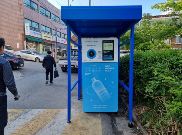 ‘AI 무인수거기’는  사물인터넷 기술을 적용한 기기로 라벨이 제거된 투명페트병을 자동 인식·분류·압착해 수거하는 자판기 형태의 비대면 수거기이다.