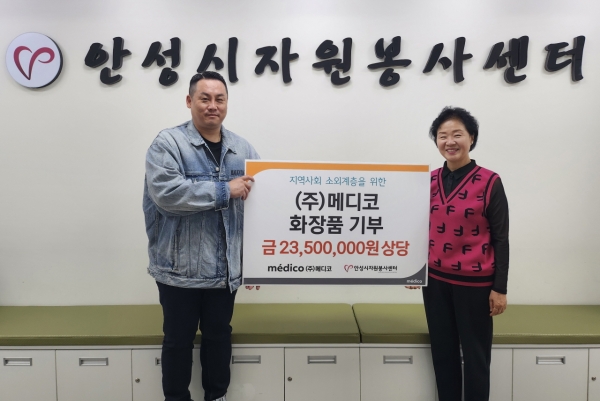 ㈜메디코는 취약계층의 생활관리 향상을 위해 2023년에도 안성시자원봉사센터에 830만원 상당의 화장품을 기부한 바 있다.