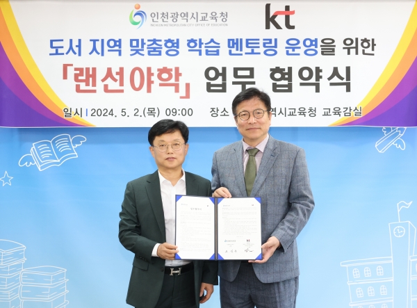 [금요저널] 인천광역시교육청은 2일 KT와 도서 지역 학생 맞춤형 학습 멘토링 프로그램 ‘랜선야학’ 운영을 위한 업무협약을 체결했다.