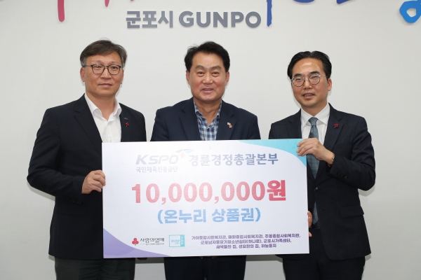 [금요저널] 국민체육진흥공단 경륜경정총괄본부 산본사업소는 2일 군포시청을 방문해 관내 사회복지시설 8개소에 온누리상품권 1000만원을 전달했다.