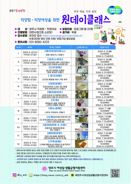 [금요저널] 양주시 여성일·생활균형지원센터에서는 오는 13일부터 업무 스트레스와 가사 및 자녀양육에 지친 직장맘·직장여성을 위한 ‘원데이클래스’ 참여자 모집을 시작한다.
