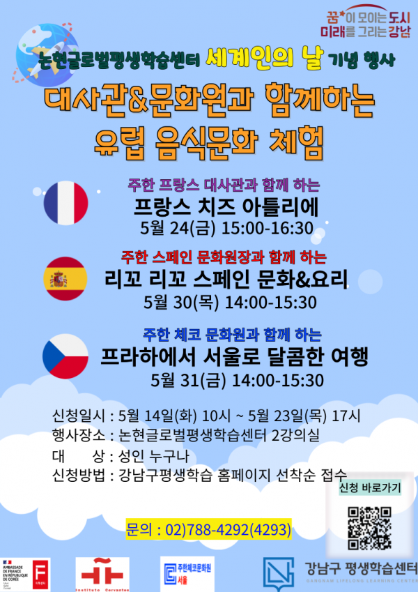[금요저널] 꿈이 모이는 도시, 미래를 그리는 강남구가 세계인의 날을 맞아 논현글로벌평생학습센터에서 프랑스, 스페인, 체코 등 유럽 3개국의 음식문화 체험 프로그램을 개최한다.
