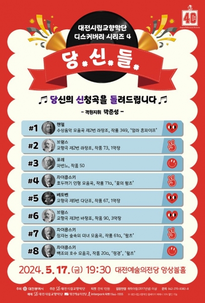 대전시향은 지난해 두 번의 오프라인 연주회와 소셜네트워크를 통해 관객들을 대상으로 신청곡을 조사해, 총 134곡의 신청곡 중 8곡을 선정했다.