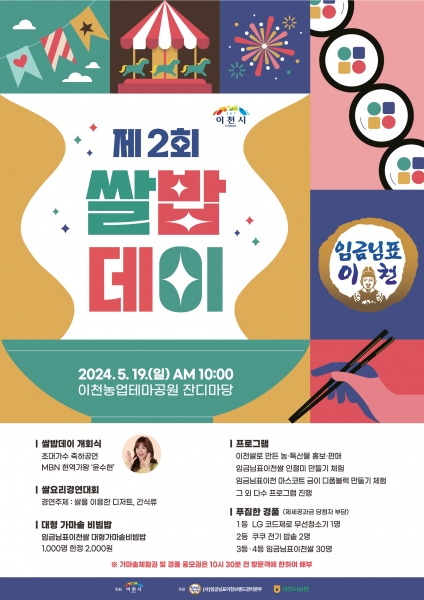 이천시가 쌀 소비 촉진을 위해 기획한 ‘쌀밥데이’는 쌀 소비가 지속적으로 줄고 있는 상황에서 대한민국 쌀 산업의 위기를 극복하고자 선도적으로 추진했으며 현대인의 식생활 트랜드 변화에 따라 다양한 쌀 요리를 발굴하기 위한 ‘쌀 요리 경연대회’도 이날 현장에서 라이브로 경연을 펼칠 예정이다.