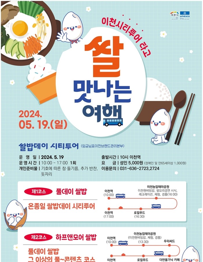 이번 ‘쌀 맛나는 여행’은 19일 임금님표 이천브랜드 관리본부에서 개최하는 쌀밥데이를 테마로 ▲풀데이 쌀밥코스 ▲하프앤모어 쌀밥코스 두 가지 코스로 운영한다.