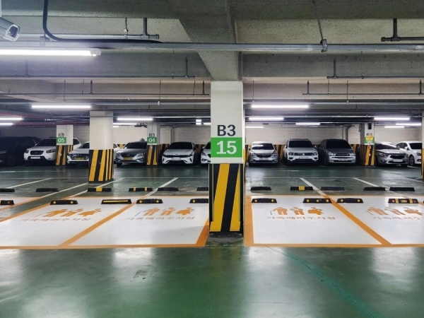 주차장 진입 시 쉽게 알아볼 수 있도록 주차구획선은 흰색 바탕에 꽃담황토색 실선으로 ‘가족배려주차장’ 그림과 함께 표시된다.