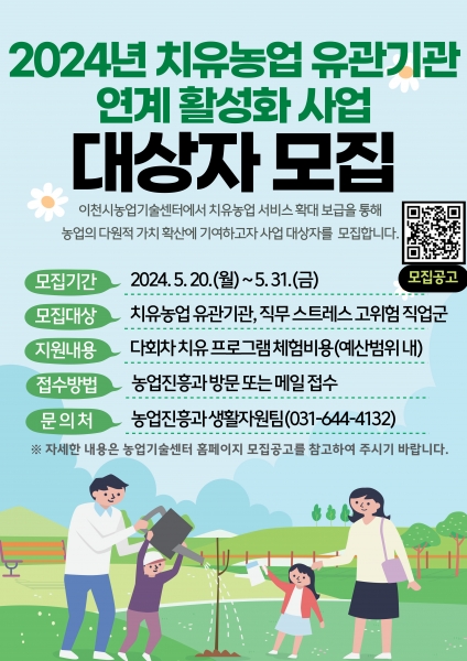 [금요저널] 이천시는 5월 31일까지 2024년 치유농업 유관기관 연계 활성화 사업 대상자를 모집한다.