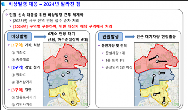 호우경보 등 기상특보에 따른 비상발령 시, 서구 전역을 3개 권역으로 구분해 구역별 2개소, 총 6개소의 전진기지에 하수준설장비 및 준설원 6팀이 대기한다.