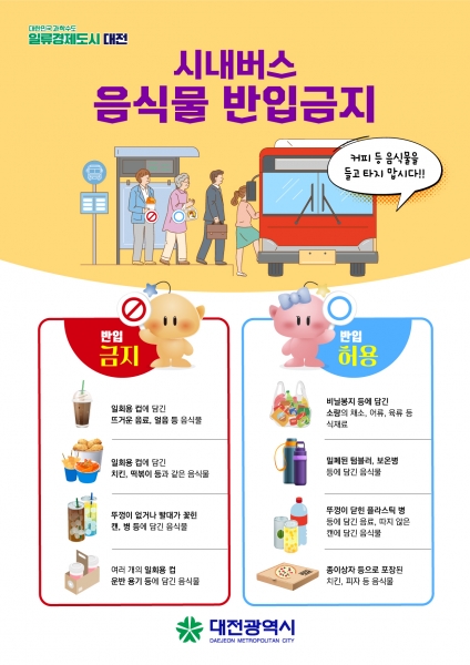 [금요저널] 대전시는 시내버스 탑승 시 음식물 반입금지 규정을 담은‘대전시 시내버스 준공영제 운영 조례’가 본격 시행됨에 따라 승차 거부에 대한 구체적 기준을 마련했다.