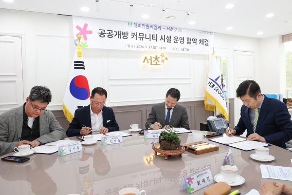 서울 서초구는 지난 27일 래미안원베일리 공공개방 커뮤니티 시설 개방을 위한 서초구-래미안원베일리 입주자대표회의-신반포3차·경남아파트 주택재건축정비사업조합-한솔아이키움 간 협약을 체결했다.