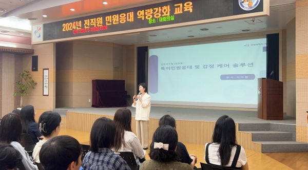 이번 교육은 위드원 교육컨설팅 대표 이미원 강사를 초빙해 ‘특이민원응대 및 감정케어 솔루션’이라는 주제로 △퀴즈로 알아보는 민원응대 개정안 △특이민원에 대한 시각 재조명 △유형별 민원사례 및 응대 방법 △현명한 감정케어 솔루션에 관한 내용으로 진행됐다.