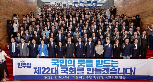이날 권향엽 의원은 국회 로텐더홀 계단에서 열린 더불어민주당 의원총회에 참석해 제22대 국회의원들과 함께 개원 각오를 다졌다.