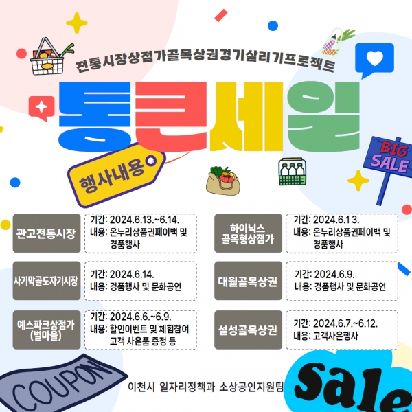 ‘2024년 경기 살리기 통큰세일’ 사업은 지역상권의 위축된 소비심리를 개선하기 위해 경기도시장상권진흥원에서 주관하는 행사형 공모사업으로 이천시 관고전통시장 등 6개소는 지난 5월 최종 선정됐다.